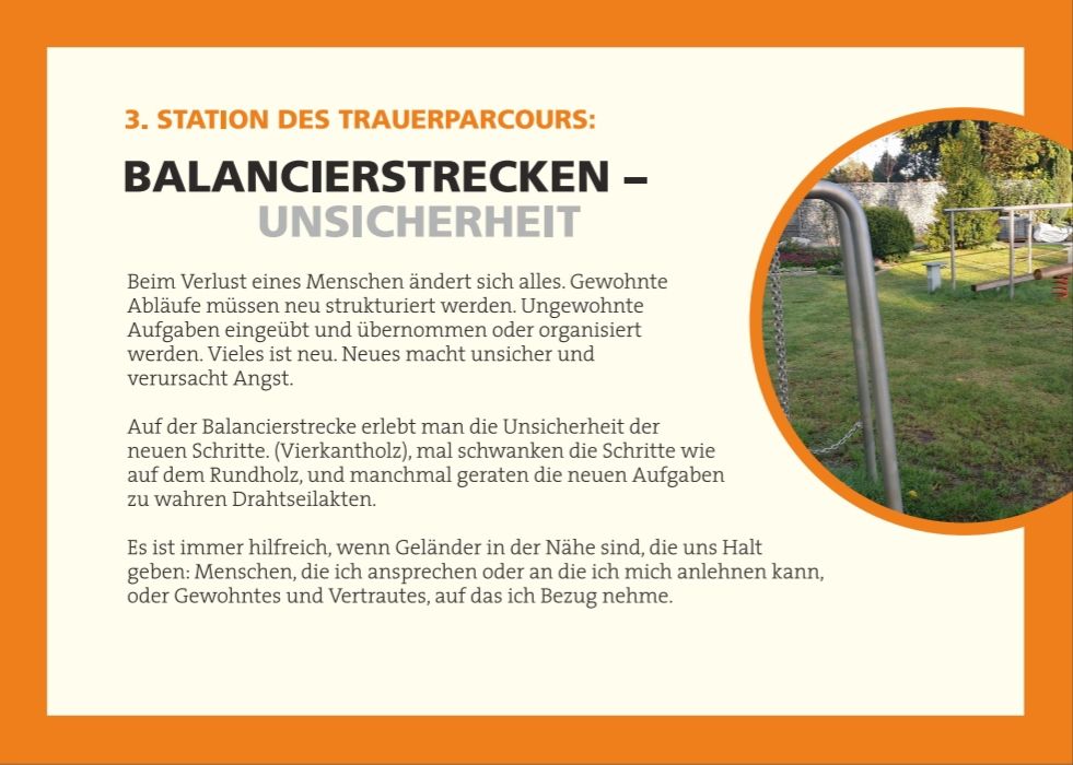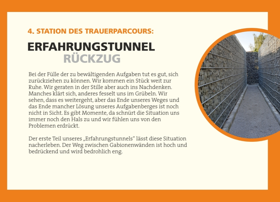 Auf dem Friedhof in der von-Flotow-Straße bieten wir unseren Besuchern eine neue Art der aktiven Auseinandersetzung mit der Trauer an. Im Rahmen des Friedhofstages am 12. September 2020 konnte der Trauerparcours offiziell eröffnet werden, der sich mit den unterschiedlichen Situationen in der Trauer beschäftigt. Auf großen Pylonen wird ein Überblick über die behandelten fünf Themen gegeben. Die einzelnen Trauersituationen werden jeweils an den entsprechenden Stellen erklärt. "Endlosspiegelschacht" (Thema Schock), "Drehstein" (Thema Wut), "Balancierstrecke" (Thema Unsicherheit), "Erfahrungstunnel" (Themen Rückzug und Resilienz), der in den Rosengarten führt, laden zum "begehen" der persönlichen Trauersituation ein und bieten mit dem Rosengarten, ein Sinnbild für verarbeitete Trauer und neue Lebensperspektive.